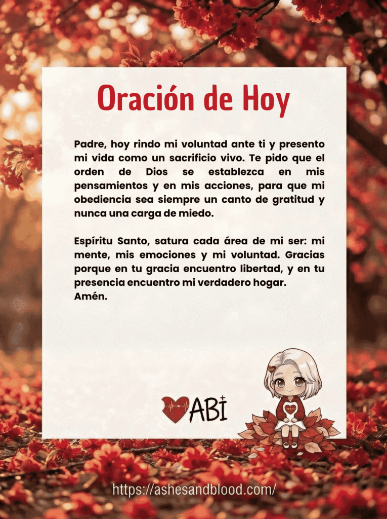 Padre, hoy rindo mi voluntad ante ti y presento mi vida como un sacrificio vivo. Te pido que el orden de Dios se establezca en mis pensamientos y en mis acciones, para que mi obediencia sea siempre un canto de gratitud y nunca una carga de miedo.